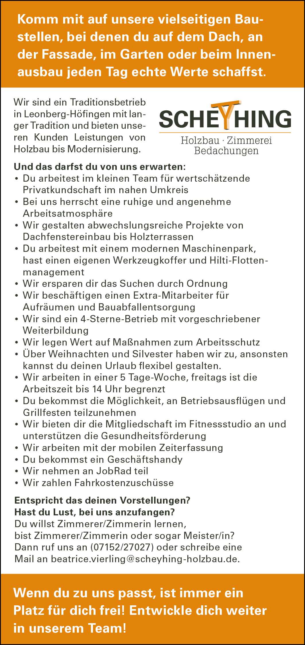 Sichere und faire Bedingungen Geregelte Arbeitszeiten mit kurzen Freitagen, 30 Tage Urlaub und leistungsgerechte, transparente Bezahlung mit steuerfreien Extras.Top ausgestattetHochwertige Arbeitskleidung, eigenes Werkzeug und modernste Maschinen für effizientes Arbeiten.Abwechslungsreiche AufgabenSpannende, verantwortungsvolle Projekte mit natürlichem Werkstoff Holz – nie eintönig, immer mitgestaltend.Flache Hierarchien & VertrauenWir arbeiten auf Augenhöhe, mit kurzen Entscheidungswegen und echtem Teamgeist.Wertschätzung & EntwicklungFortbildungen, betriebliche Altersvorsorge und Platz für neue Ideen.Gemeinschaft, die verbindetRegelmäßige Grillfeste, Betriebsausflüge und Aktionen stärken unser Miteinander